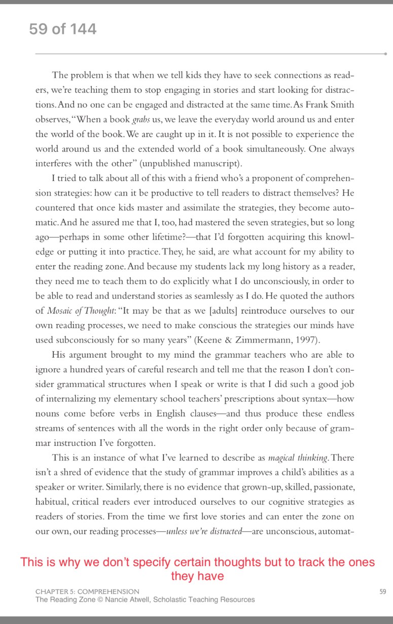 The red annotation is mine. When we teach lessons on reading, while we might model certain things readers do, we are clear that it’s about teaching them to be aware of what their minds are doing, stop and jot what their thought is, and then to try and name it, sometimes with the help of a conference.