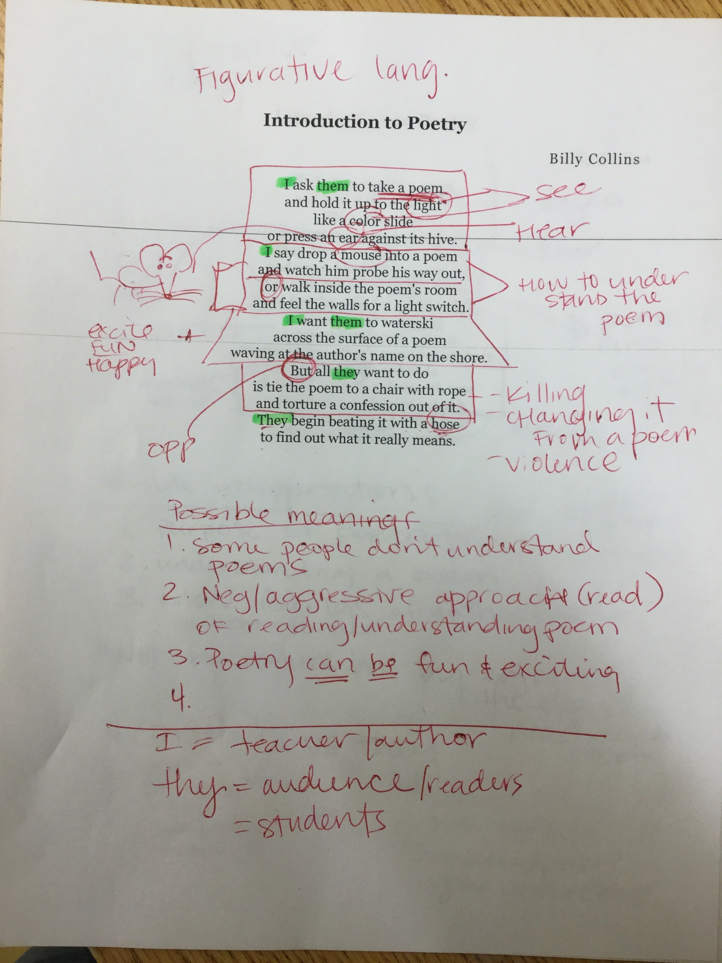 *Mac sent this article after I had already started the unit as food for thought and I was so amazed at how much Louise Rosenblatt’s article “The Poem as Event” aligned with what I was doing with the students without my even having read it!