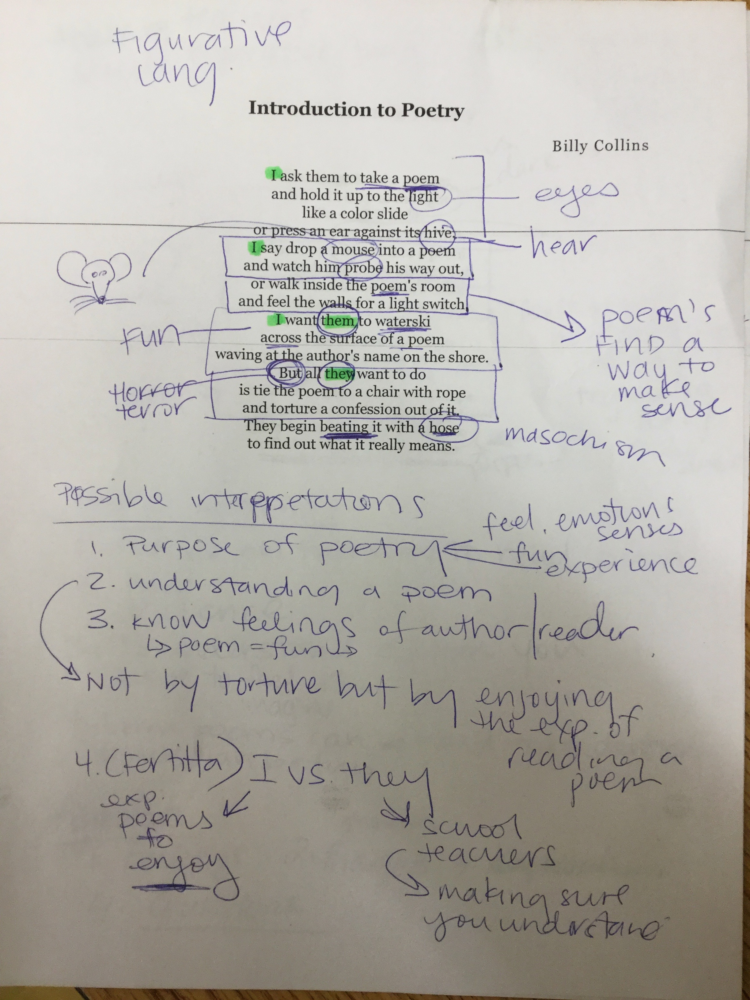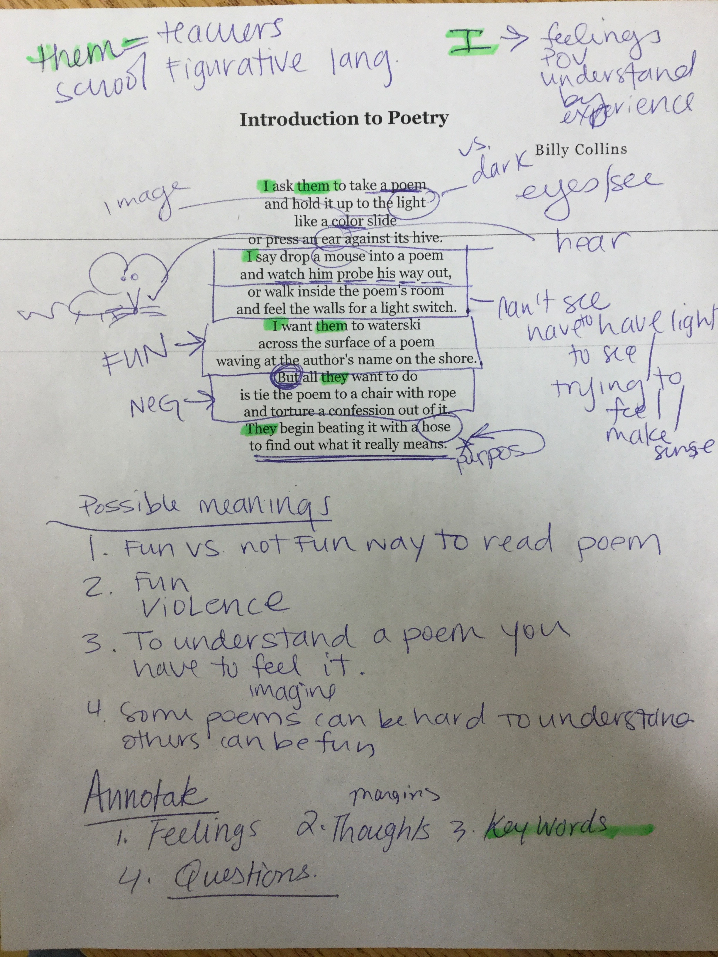 This post’s focus is on the instruction and reading of poetry. I will write another to address how students created responses and analysis for what they read.