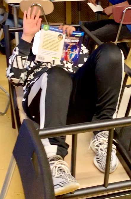 As fun as the flexible seating can be, it doesn’t mean there are no desks or students who choose traditional seating. Below is a pair of students reading and working together at a desk. You can see that they have situated themselves so that they can communicate and collaborate together, yet not be distracted by other working students.
