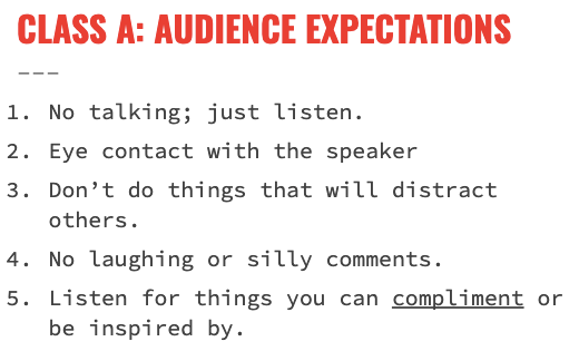 In each class, the same way you might create general rules for behavior, we co-created shared audience expectations. For example:
