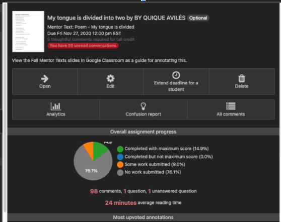 Now, I do not require all students use Perusall. Remote learning is challenging for many of my students who often work asynchronously due to jobs or have to share wifi or devices with younger siblings. Even just for students who do work synchronously on Zoom with me, they are often on a phone, so moving between different digital tools is exhausting and aggravating. So, I make it available as an option and when we do breakout rooms, one student can screen share and annotate as they all discuss. It’s tedious, so we don’t do it often. Students use my Mentor Text Analysis Google Form more often.