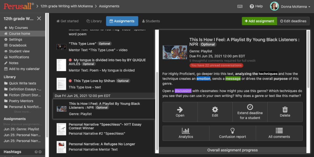 If digital access prevents them from demonstrating that level of mastery, there are still other ways to demonstrate it through conversation with me. So for most, Perusall is more of a resource library of mentor texts that I use in video lessons or that the access without annotating.
