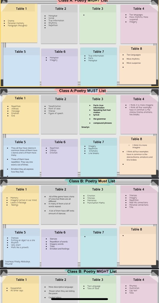 We did that for one week and at the end, determined a final “Must” and “Might” list with a little input from me as well, which they can refer to when they write poetry.