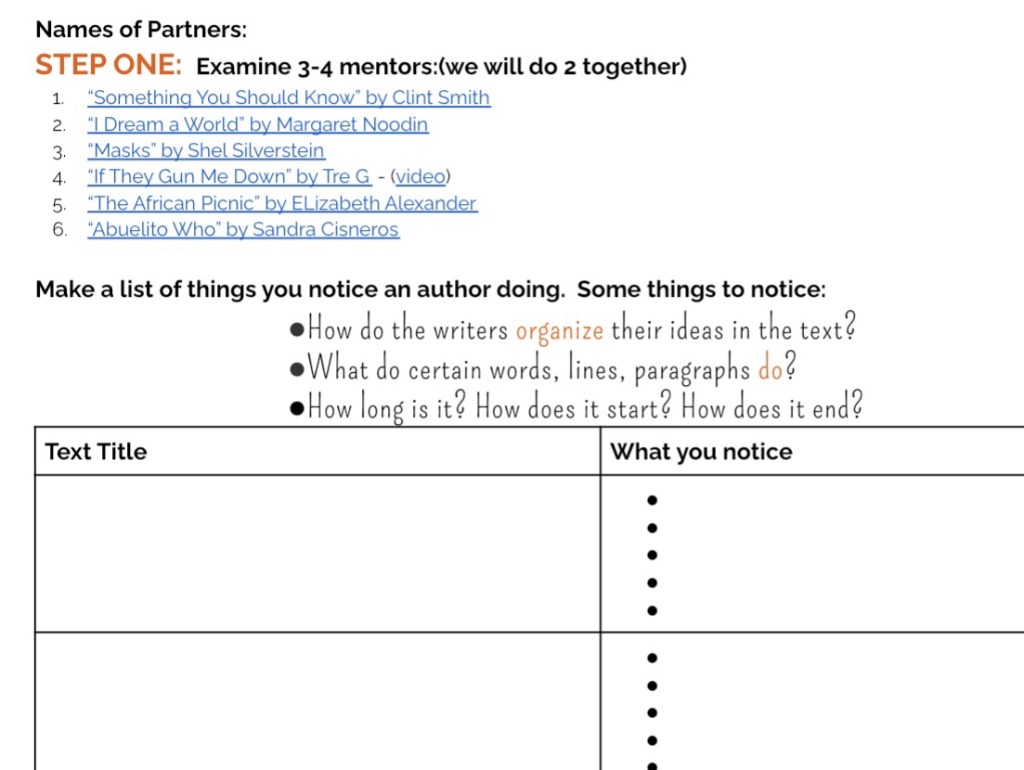 To teach them some basic terminology (stanza, line break, imagery), I modeled how to notice and name what I noticed the author doing.